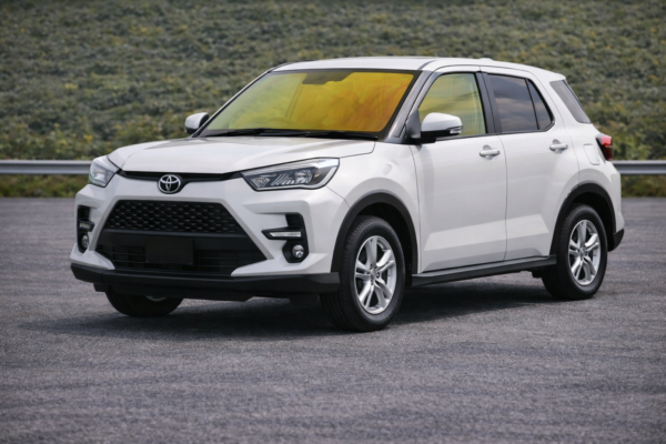 🚗 トヨタ ライズ(A200A・2019.11〜)のフロントガラス形状に合わせて設計された、車種専用カット済みのスパッタゴールドカーフィルムです。