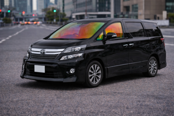 🌈 ファンキーゴースト99は、画像で確認できるように、グリーンを基調としながら角度や光量によってイエロー・オレンジ・レッドへと変化する特徴的な色調を持つフィルムとして整理しやすい存在です。いわゆる「虹色一色」ではなく、実車ではガラス上部から下部にかけて色のグラデーションが現れやすく、ヴェルファイアの重厚なフロントフェイスと組み合わせた際にも、ガラス面が自然なアクセントとして際立ちやすい傾向があります。☀️