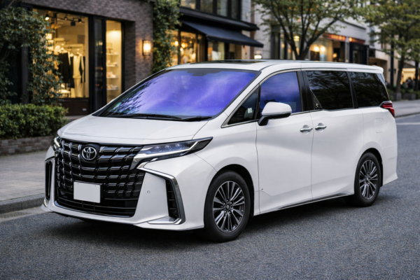 ☀️ 高級感のあるアルファードのフロントビューに自然に溶け込み、街中や代官山のような都会的なシーンでもガラスの表情を引き立てます。