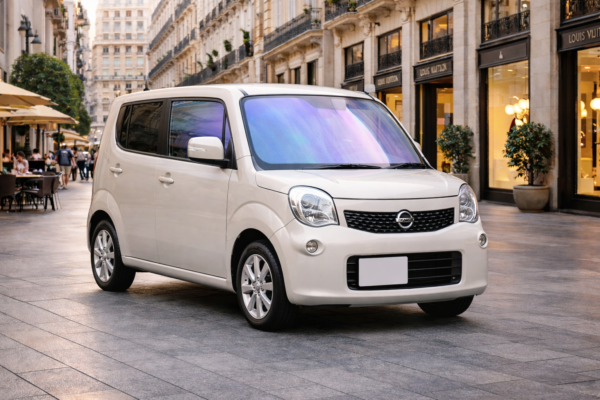 🚗 日産モコ MG33S(H23.2〜)のガラス形状に合わせて設計された、ゼノン2オーロラ84のカット済みカーフィルムです。🌈 フロントガラス・運転席・助手席の3面はすべて同等カラーで統一し、提示された基準画像どおりの青紫〜バイオレット系オーロラ発色とプリズム感をそのまま反映しています。☀️ 丸みのあるモコのボディデザインとも相性が良く、光の入り方によってガラス表情がやさしく変化する印象です。🛠️ 車種・型式・年式専用のカット済み仕様のため、施工時のガラスラインを想定しやすく、仕上がりイメージを掴みやすい構成になっています。✨ リア側はプライバシーガラス表現とし、フロント3面のオーロラカラーとのコントラストを意識した見え方です。