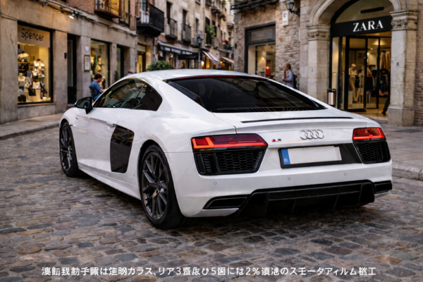 🌈 スモーク系の自然な色味で、R8特有のエンジンルームまわりやリアビューの存在感を損なわない仕上がりを意識しています。