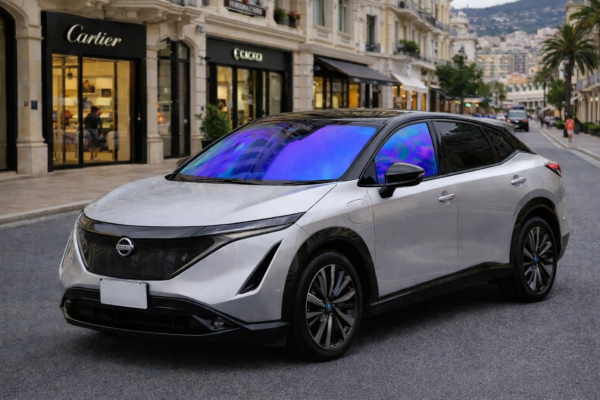 🌈 シャインゴーストは、見る角度や光の当たり方によって青紫〜バイオレットへと変化する多層オーロラ発色が特長です。高級ブティックが立ち並ぶモナコ市ショッピング街の街並みをガラス面に映し込みながら、フロント3面のみが鮮やかに発色することで、アリアの先進的なデザインと調和したスタイリングを演出します。