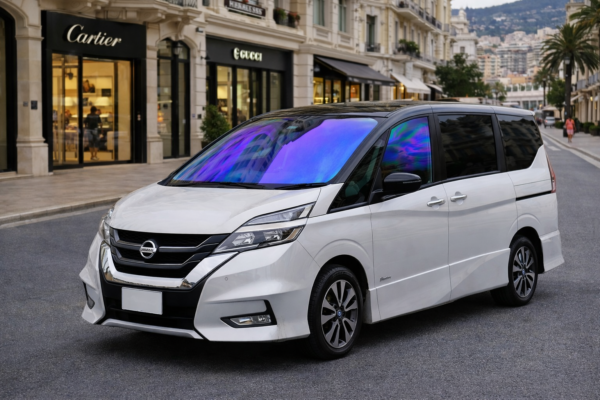 ☀️ 正面からはしっかりと色味を感じられ、斜めからは透明感のあるブルートーンへ変化。日産 セレナワゴン GC27のボディラインと相性の良い上品なドレスアップ効果を演出します。リアはプライバシーガラスの落ち着いたトーンで統一し、前後のコントラストを明確にしています。