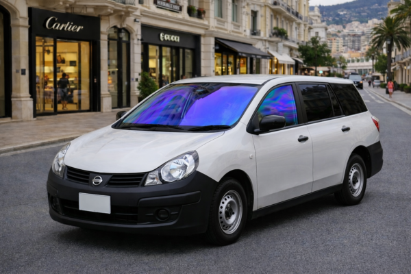 ☀️ 日産 ADバン DBE-VAY12の実用的なボディラインに、透明感のあるカラーアクセントを追加。リアはプライバシーガラスの落ち着いた濃色で統一し、前後のコントラストを明確に仕上げています。