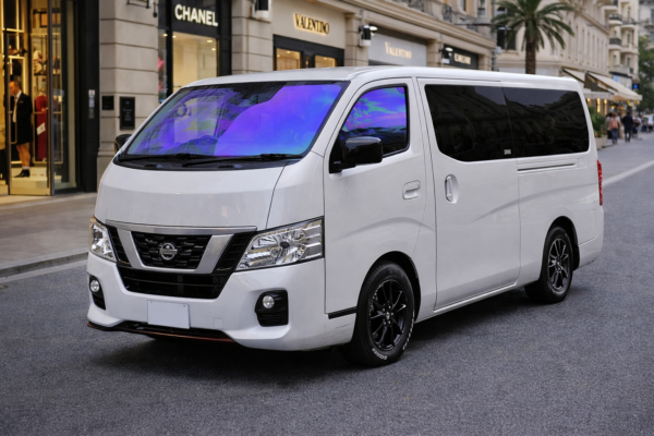 🚗 日産 NV350 キャラバン 5ドア スーパーロング CS4E26(H24.6〜)専用設計のシャインゴースト フィルム。フロントガラス・運転席・助手席の3面に、画像と同一のシャインゴースト発色をそのまま採用。ミラノ市ショッピング街の街並みを映り込ませることで、青〜紫へと変化するオーロラカラーがより立体的に際立ちます。リア3面および5面は純正プライバシーガラス仕様、ナンバーは無地で統一しています。
