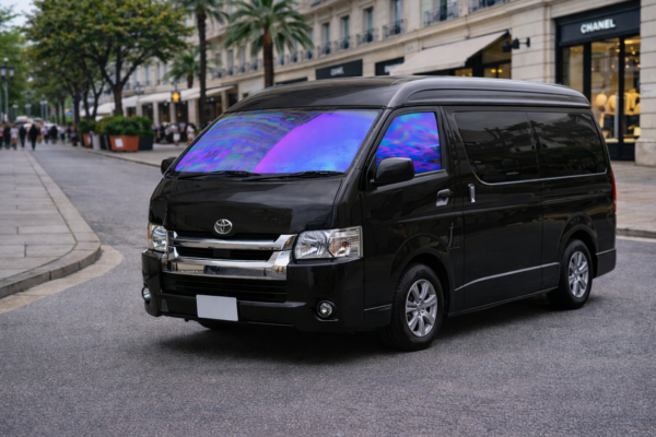 ☀️ 外からは鮮やかな反射を演出しつつ、室内の視認性も確保したバランス設計です。ハイエースのスクエアボディとの相性も良く、商用車の印象をスタイリッシュに引き上げます。