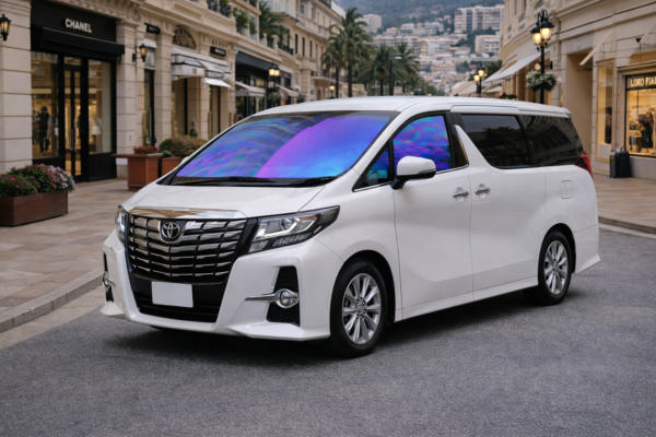 🚗 トヨタ アルファード AGH35HW(H26.1〜)専用設計のシャインゴーストフィルムです。運転席・助手席に施工することで、ブルーからバイオレットへと滑らかに変化する独特のオーロラ発色を再現します。大型フロントガラスを持つアルファード AGH35HW に映えるカラーリングです。