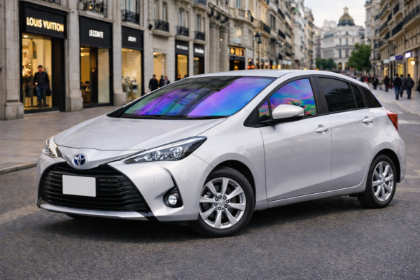 🌈 シャインゴースト特有のオーロラ発色は、角度や光の強さによりブルー〜パープルへと色味が変化。日中の直射光では高反射、夕方や曇天では落ち着いたトーンへ移ろい、ヴィッツのコンパクトボディにさりげない存在感を与えます。