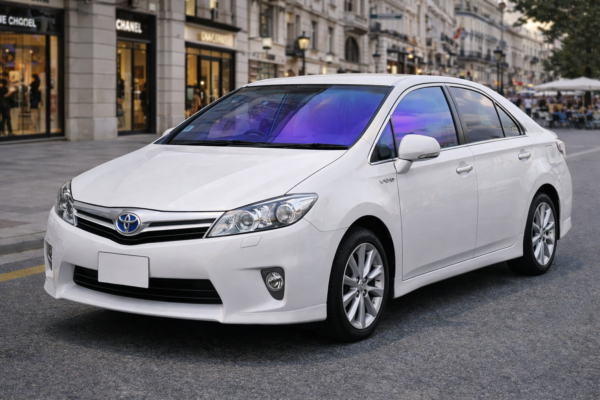 🚗 トヨタ SAI(AZK10 H21.12〜)の運転席・助手席専用シャインゴーストフィルム施工イメージです。🌈 紫からブルーへと滑らかに変化するオーロラ発色が特徴で、角度や光の当たり方によって表情を変える独特のゴースト感を演出します。☀️ 日中の自然光では透明感を保ちながら発色し、街中の反射光では深みのあるカラーへと変化します。🛠️ 車種専用カット設計のため、SAI AZK10のガラス形状に合わせたフィット感を意識した仕様です。✨ 上品さと個性を両立したシャインゴースト施工イメージとしてご確認ください。