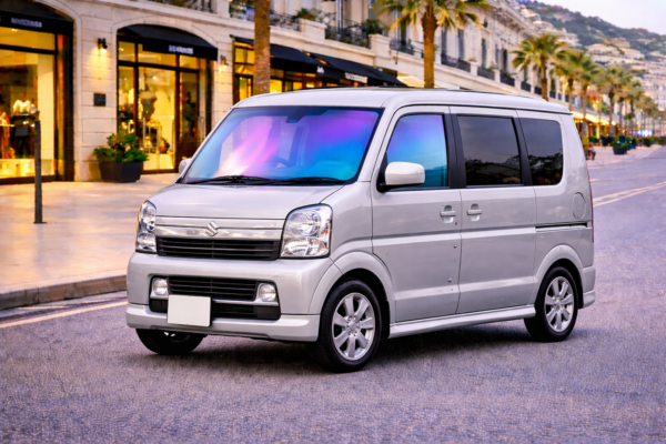 🌈 シャインゴースト特有のオーロラ発色により、光の角度や周囲環境によってブルーやパープル系へと色味が変化。エブリィ ワゴン DA64Wのボディシルエットにアクセントを加え、個性あるフロントビューを演出します。