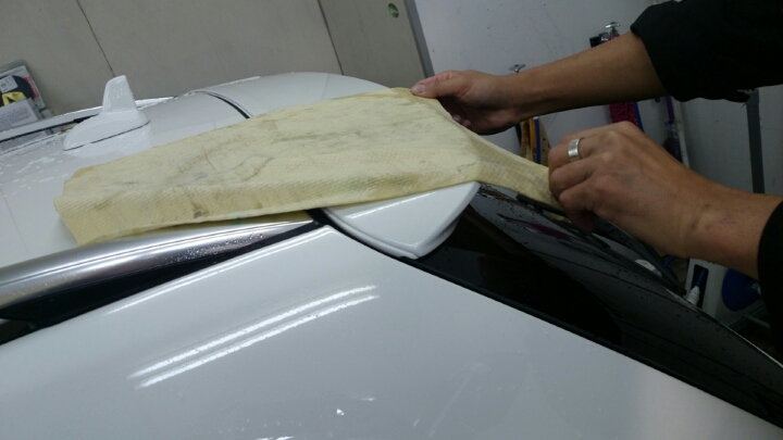 じつは拭き上げを早く終わらせるには、上記画像のように、如何にセーム皮を塗装に面してあげるかのほうが水の吸収も良いですし、早く拭き上げが終わります。この拭き上げの際も車の進行歩行で吹き上げるのが大切です。