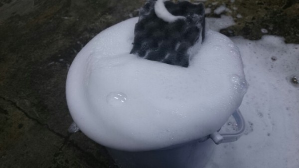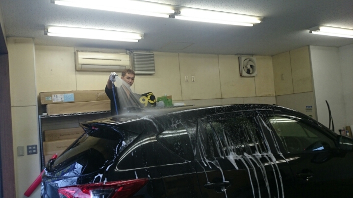 全体的に砂埃を水により落とし終わったら、次はシャンプー洗車に入ります。