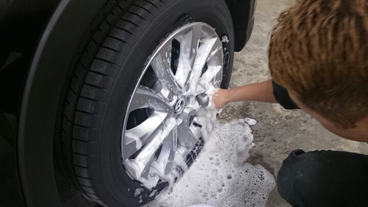 タイヤホイールをアイアンリムーバーという鉄粉落とし用の洗剤で洗います。